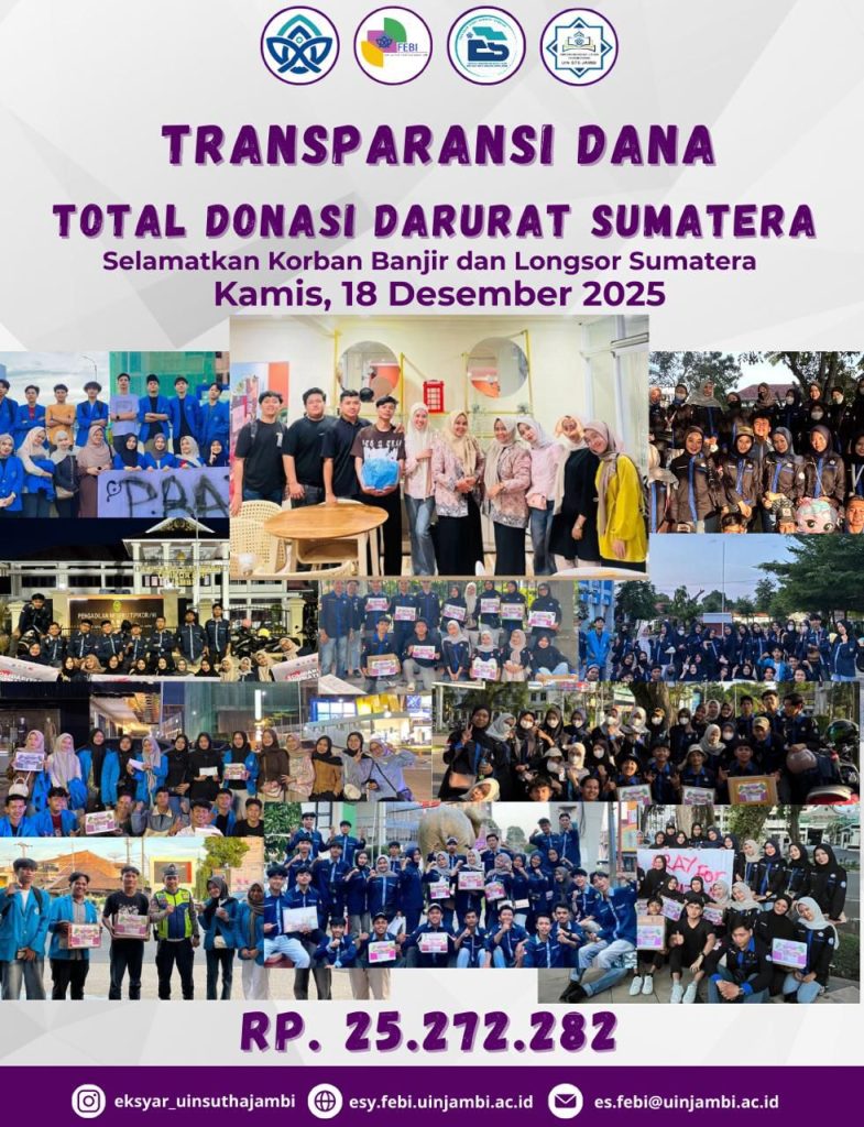Mahasiswa Program Studi Ekonomi Syariah Universitas Islam Negeri Sulthan Thaha Saifuddin Jambi melaksanakan kegiatan Penggalangan Donasi Darurat Sumatera sebagai bentuk kepedulian dan solidaritas kemanusiaan terhadap korban bencana banjir dan longsor di wilayah Sumatera. Kegiatan ini dilaksanakan pada Kamis, 18 Desember 2025 dengan melibatkan mahasiswa dari berbagai angkatan.